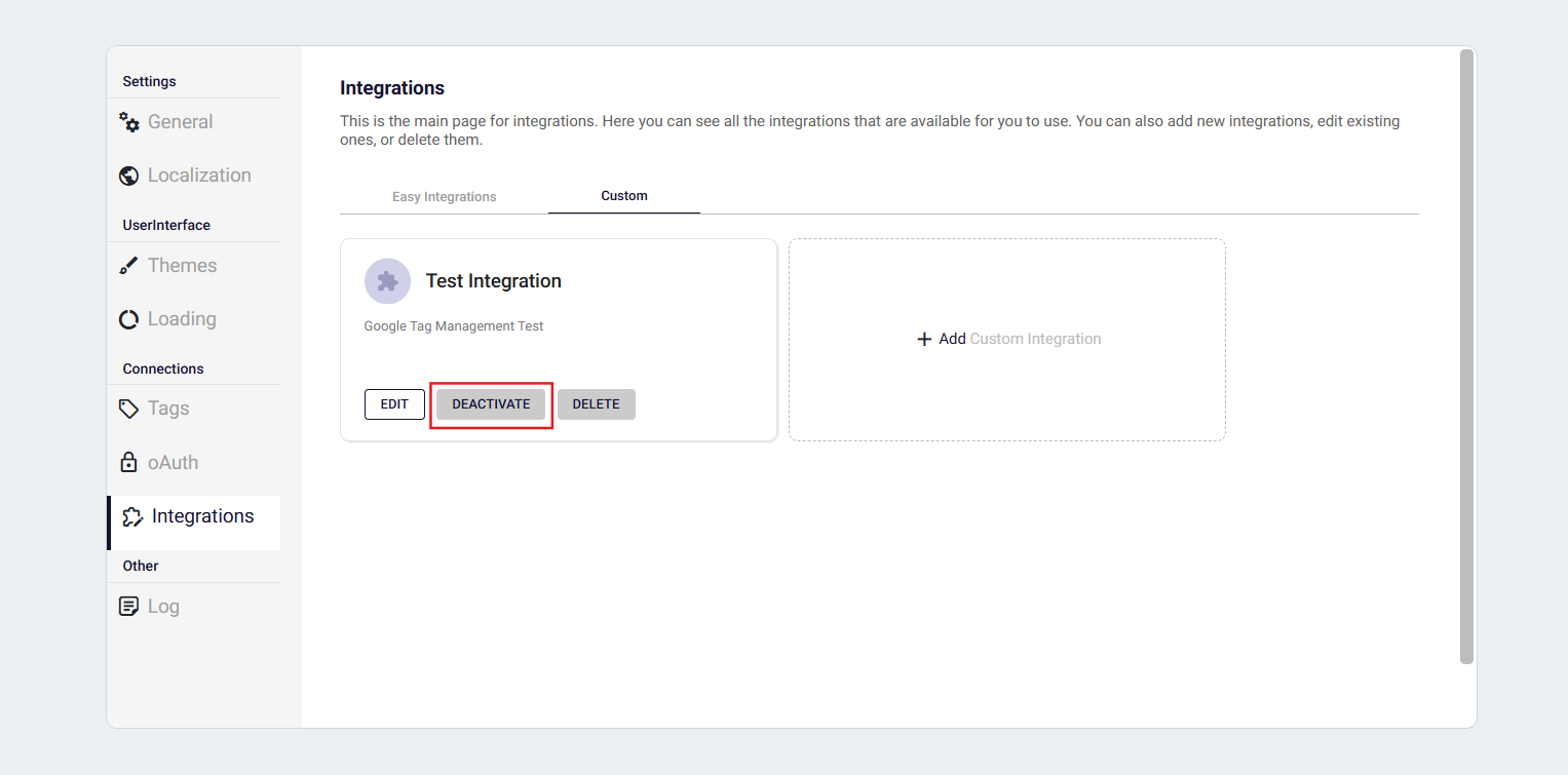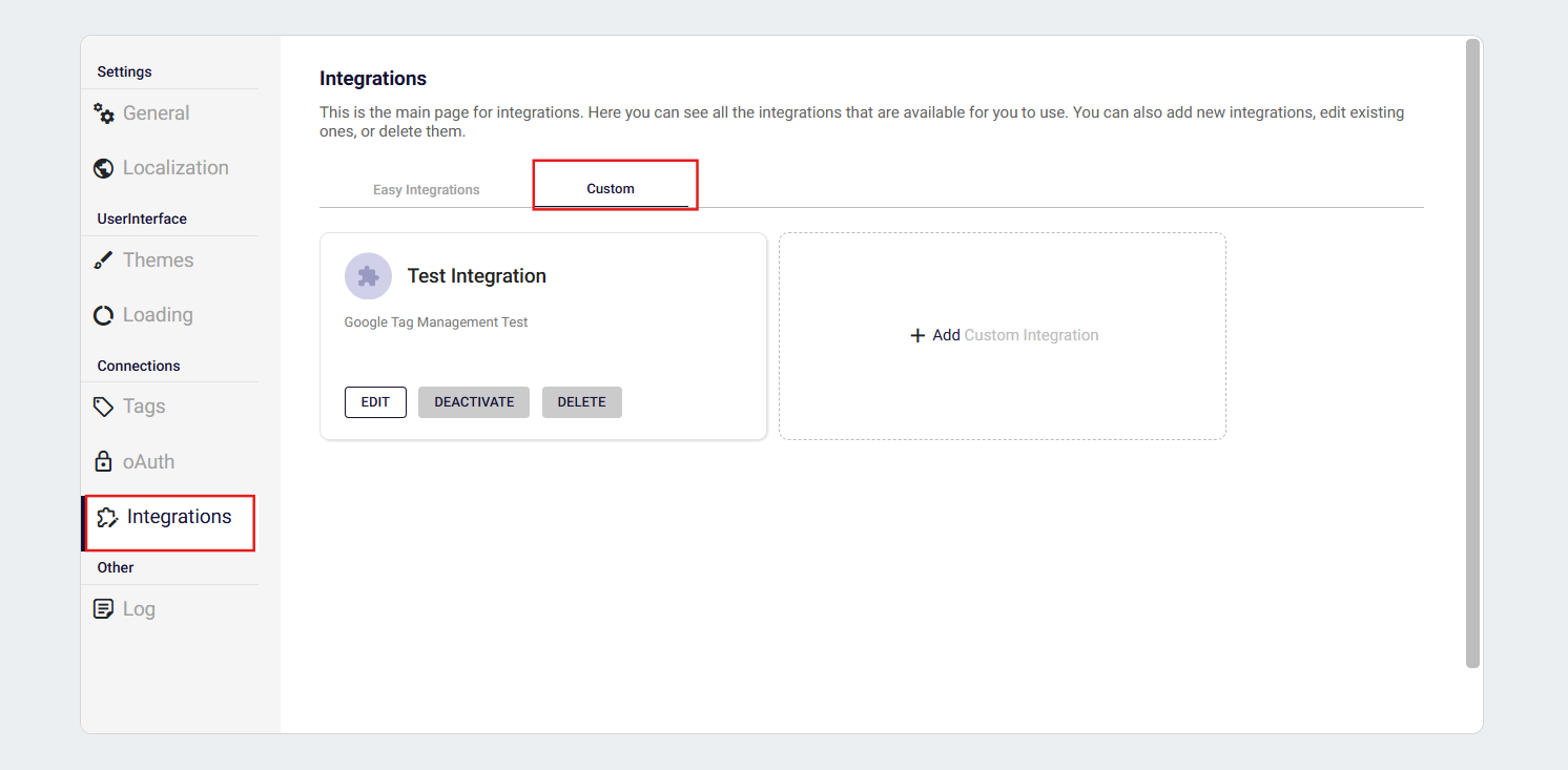 You can delete a custom integration by clicking the delete button on the integration card. This action permanently removes the integration from the application settings.