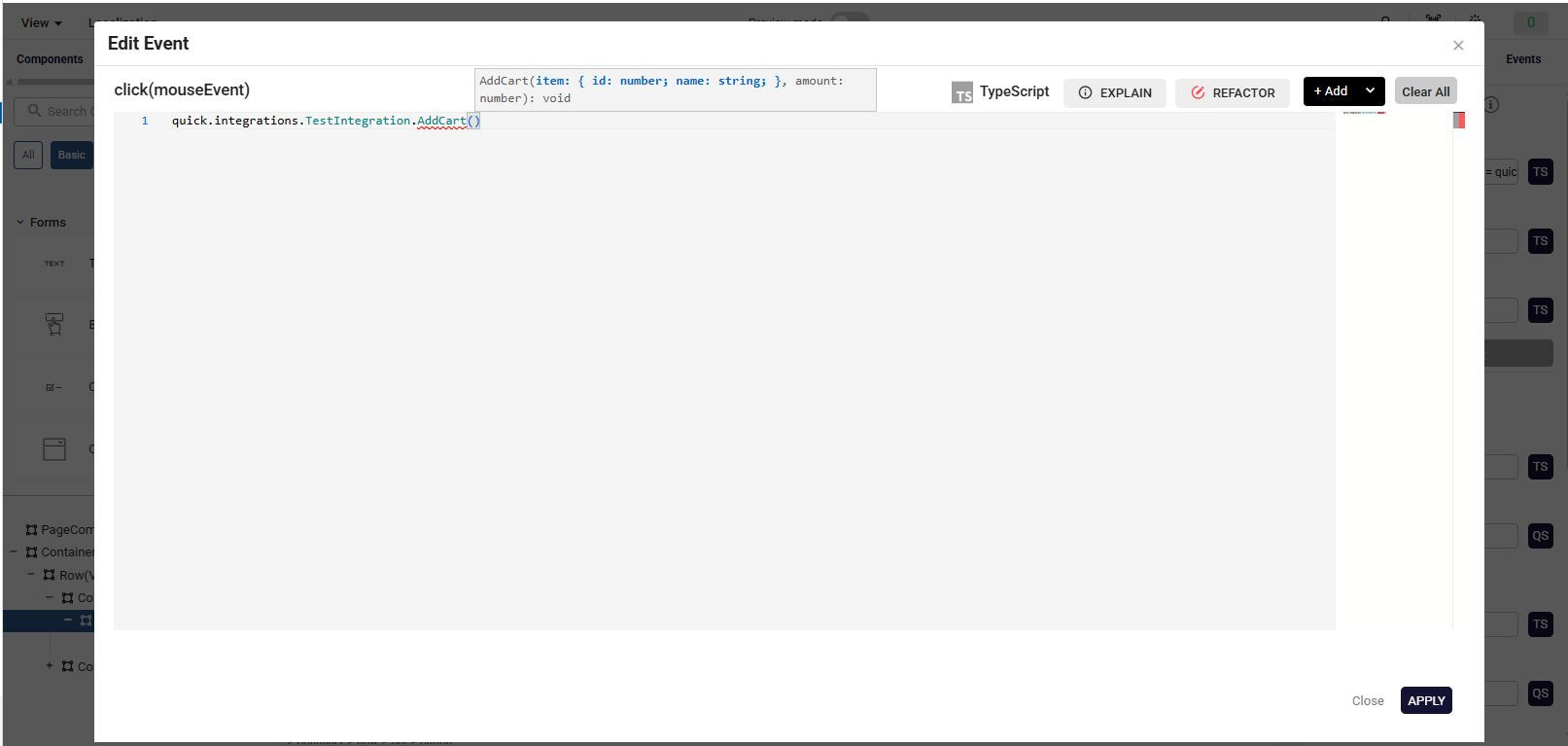 In Custom Integration, any events you define can be easily accessed and utilized within the UI Editor. These events are exposed through an IntelliSense structure that follows the pattern: