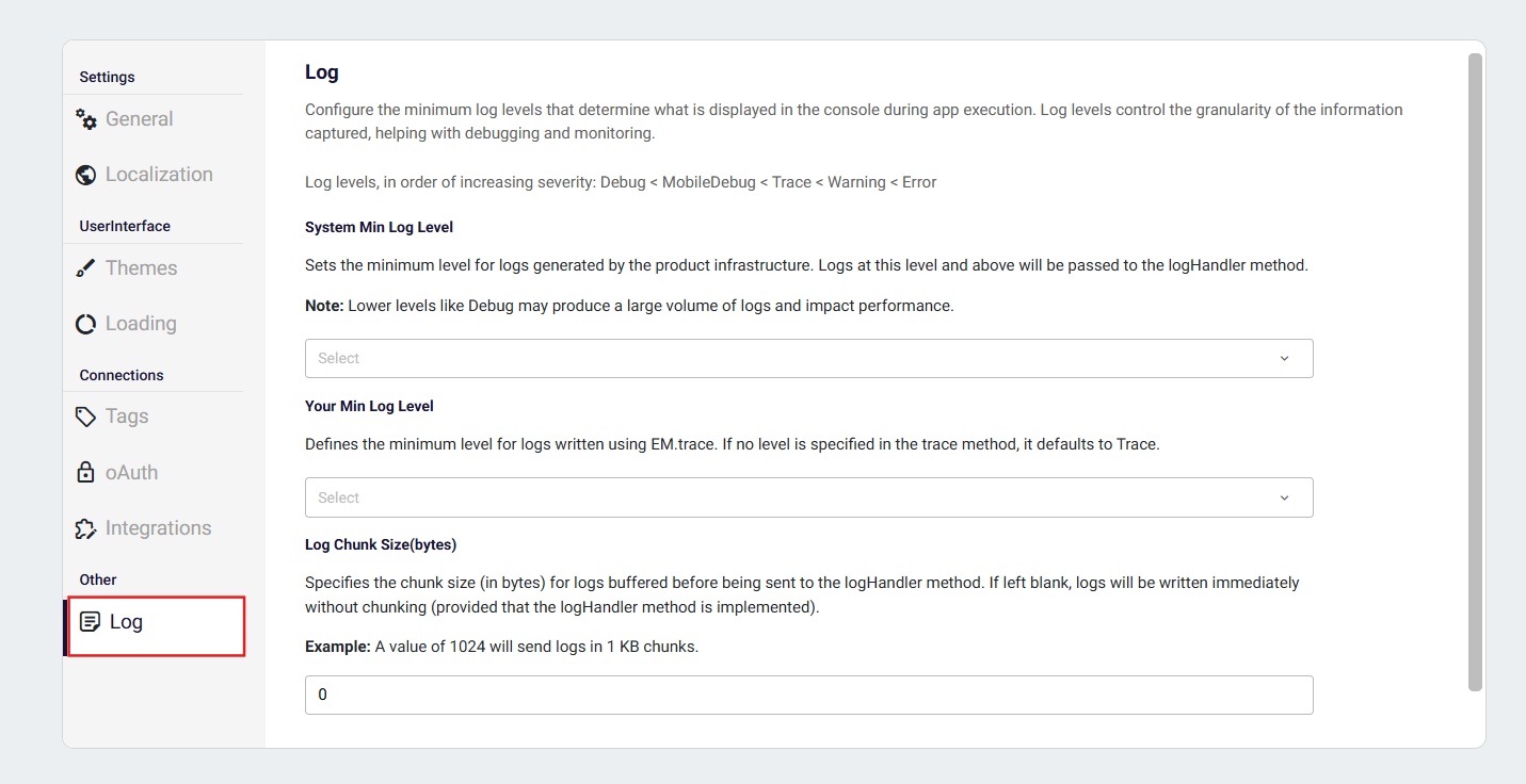 Configure the minimum log levels that determine what is displayed in the console during app execution. Log levels control the granularity of the information captured, helping with debugging and monitoring.