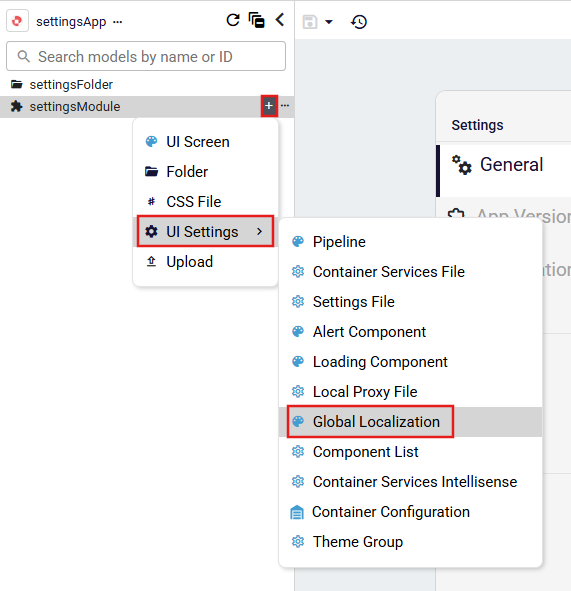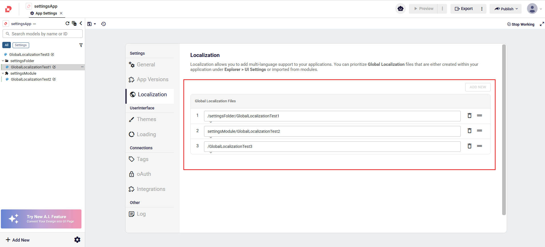 Localization allows you to add multi-language support to your applications. You can prioritize Global Localization files that are either created within your application under Explorer > UI Settings or imported from modules.