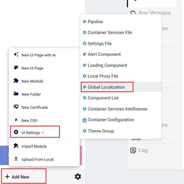 In the navigation menu on the left side of the page, click the Add New button. Then, in the UI Settings dropdown that appears, select Global Localization. Alternatively, if a folder or module has been added to the navigation menu, you can click the + action next to the item to expand its context menu and select Global Localization from the UI Settings dropdown.
