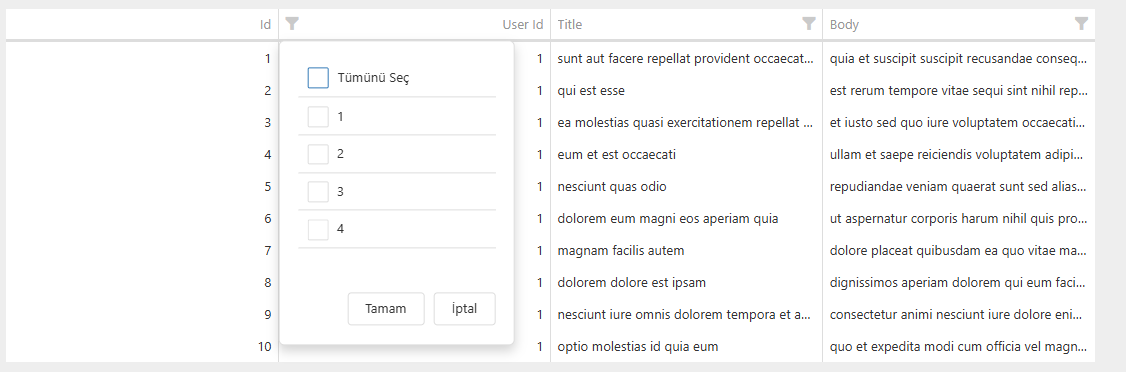 - According to the desired filtering process, it is used by giving the header name, item name or parameters to be filtered into the filter method.
