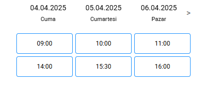 | dailyTimeSlots | Defines the available dates and time slots for appointments. Each item includes a date, times, and optionally disabledTimes. Example: [ { date: '04-04-2025', times: ['09:00', '10:00'], disabledTimes: ['10:00'] } ] | Array |